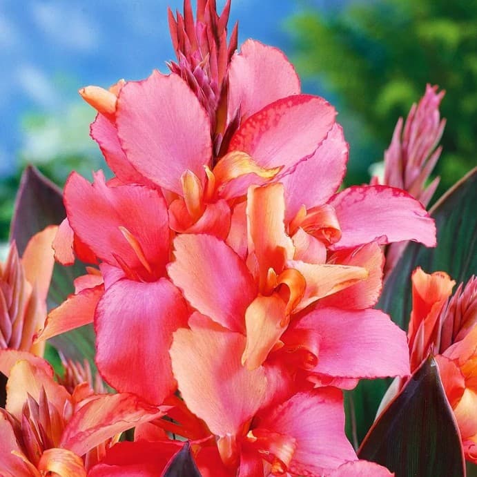 Стройная, элегантная кaннa Чeмпиoн всегда будет привлекать внимание в сложных цветниках и послужит отличным центром для Вашей композиции. Она имеет крупные цветы с лепестками милого персиково-кораллового цвета с аккуратным переходом к желтой серединке. Зелено-бронзовые листья создают им прекрасный фон. Пышные и яркие соцветия будут радовать Вас практически всё лето, до наступления первых осенних заморозков.